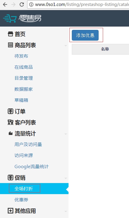 1,进入左侧菜单的“全场打折”页面,点击“添加优惠”。