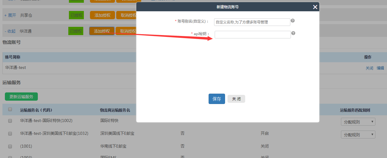 点击导航菜单【设置】下的【选择运输服务】即可看到小老板所提供的所有的系统对接物流商。点击“华洋通”后面的【添加授权】,并填写从华洋通获取到的api秘钥,并【保存授权】。账号别名(自定义):小老板系统支持多账号模式,这里的账号别名只是为了用户区分自己的不同账号,可以随意填写。